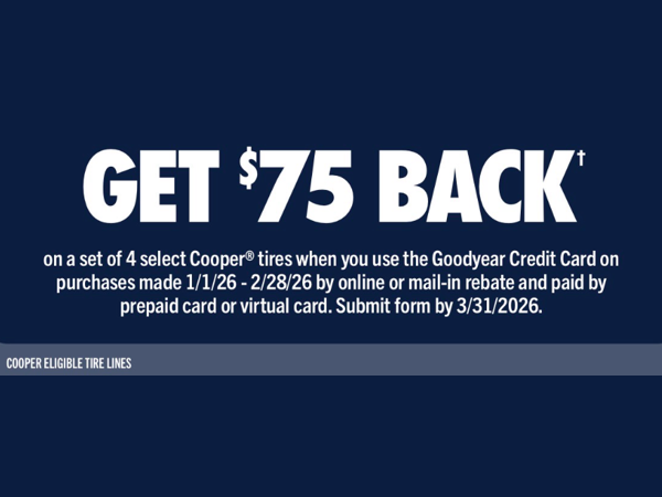 $75 Back Offer Valid Through February 28, 2026 Click Here to Shop Tires! Back Share on Facebook - $75 Back (opens in a new window)Share on Twitter - $75 Back (opens in a new window)Share on LinkedIn - $75 Back (opens in a new window)